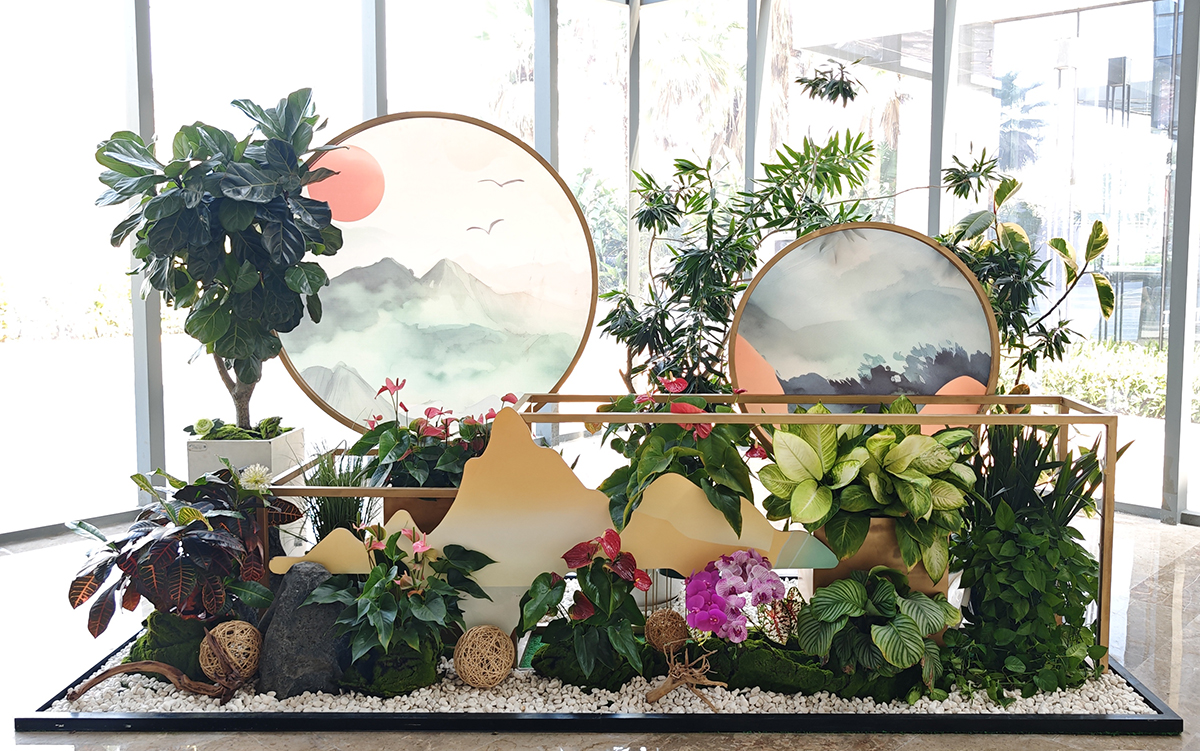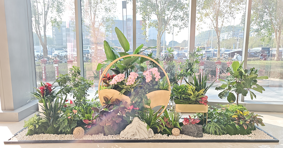 设计理念:高低错落的植物层次分明,天堂鸟的挺拔、百合竹的飘逸、变叶木的斑斓交织在一起,构成了一幅自然和谐的画卷,给人以强烈的视觉冲击。红掌、粉掌和鸿运当头的鲜艳花朵点缀其中,为这片绿色世界增添了活泼与热情的色彩元素,吸引着人们的目光,激发内心的活力。整个空间弥漫着清新自然的气息,仿佛将森林的一角搬进了写字楼,让人仿佛置身于大自然的怀抱。